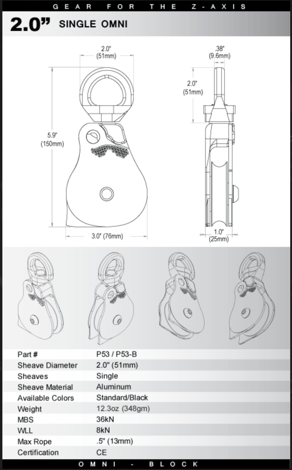The Omni-Block combines a swivel and pulley into one tool, and incorporates a unique sideplate that opens while the pulley is still attached to the anchor.