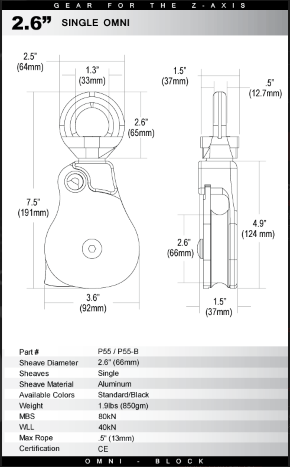 The Omni-Block combines a swivel and pulley into one tool, and incorporates a unique sideplate that opens while the pulley is still attached to the anchor.