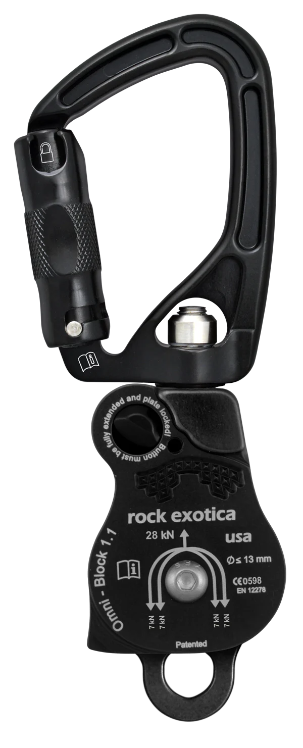 The Omni-Block SwivaBiner combines a swiveling carabiner and pulley into one tool, and incorporates a unique sideplate that opens while the pulley is still attached to the anchor. The Omni Swivabiner is available in both single and double sheave versions.