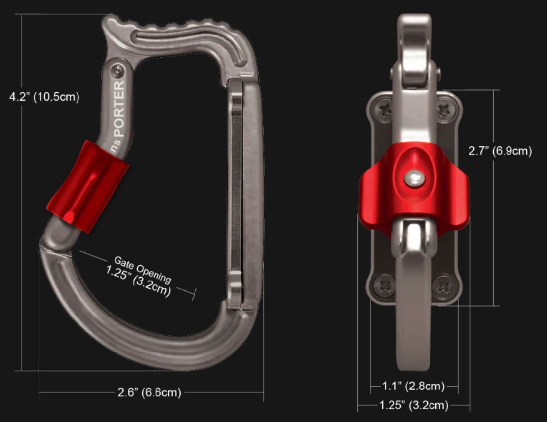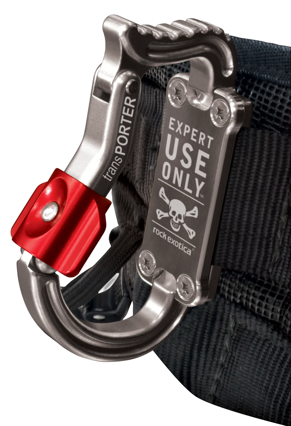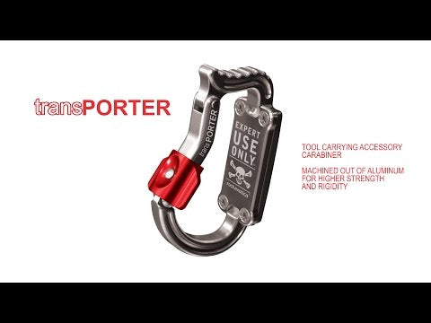 The transPorter is designed as a harness “tool-holder” made for ease of use and security. The gate is equipped with a manual locking mechanism and “wing” design. The manual locking gate is a dual push button design that you can lock if desired to prevent inadvertently snagging or hooking unwanted items. But you can also leave it unlocked when needed so you are able to remove tools quickly without fumbling to repetitively unlock the gate. Unique “wings” on the gate allow the user to single-handedly retrieve and sort gear, even with gloves on. The transPorter semi-permanently attaches to the harness, secured by an aluminum plate with removable screws. The wide plate and rigid frame ensure the transPORTER will stay in position when used with small or large tools.